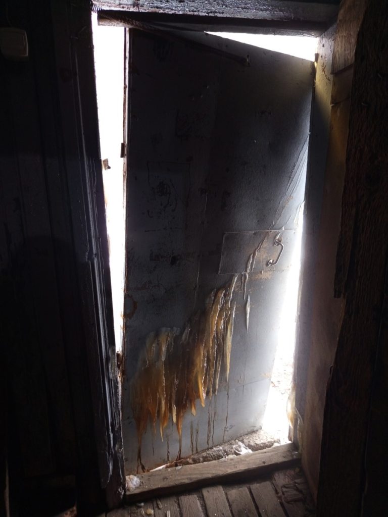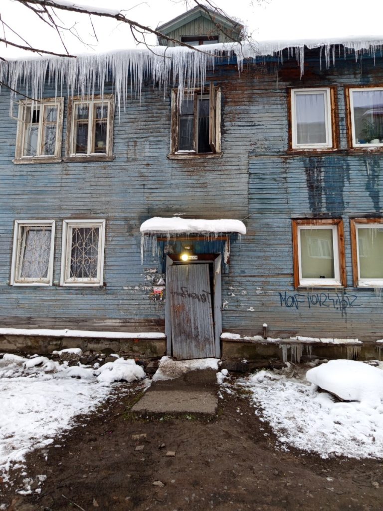 3. In Petrozavodsk, residents, including a mother and her five-month-old child, are living in an unsanitary and unsafe house. The entrance door is supported by only one hinge, creating a risk of collapse, while large icicles overhang the entrance, posing a significant danger of falling and potentially injuring residents. Steam from the basement results in very high humidity, further contributing to poor sanitation and unsafe living conditions.