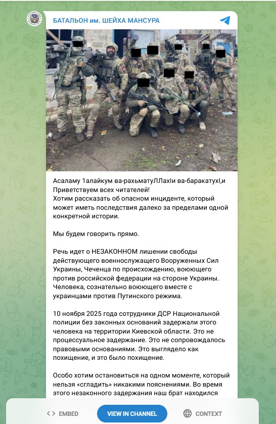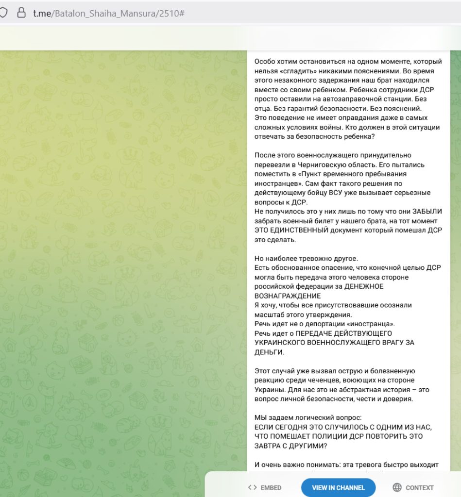 Батальон в своем телеграмм канале описал ситуацию и выразил уверенность в том, что это была преступная попытка продать чеченца в рф. https://t.me/Batalon_Shaiha_Mansura/2510 Теперь он в безопасности, но.