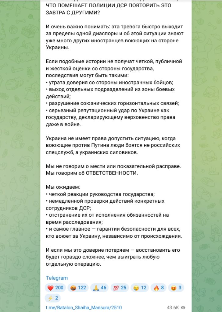 Мне стало очень интересно, почему именно в Черниговском пункте временного пребывания иностранцев, при активном содействии Черниговской ДМС, случились все эти ужасные истории. Не хочется никого обвинить голословно, однако, на кону — выдача смелых и достойных людей, поддерживающих Украину или даже борющихся против агрессора, рискуя жизнью. И эти действия указанных чиновников, по выдаче желавшего стать добровольцем человека нашему врагу, напомню, уже привели к гибели Заура Шогенцукова. Не стоит говорить, что это не эти чиновники его убили, а враг. Ибо они буквально надели на него наручники и передали его убийцам, совершенно беззащитного.