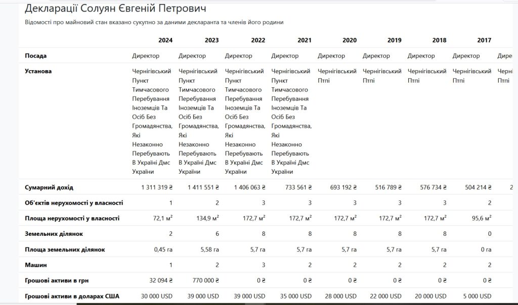А вот Солyян Евгений, директор Черниговской ПТПИ, который непонятным образом, видимо, настойчивым трудом в свободное от руководства ПТПИ время, заработал на 2 квартиры и дом, 8 земельных участков на 5,7 гектаров, 2 машины и еще и накопления отложить. Но в последние годы почти все продал здесь, в Украине. Наверное, не верит в страну.