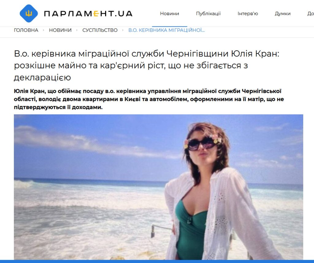 Я заинтересовалась личностями чиновников, совершивших указанные выдачи. На документах засветилась Юлия Крaн, начальница черниговской ДМС. Отказавшая Зауру Шогенцукову в статусе беженца. Письмом от имени Управления ДМС в Черниговской области № III-124/6/7401-24/7401.6/4-25 от 08.01.2025 года написав Зауру о том, что в Заключении Исполнительного комитета № 94-2002 УВКБ ООН отмечается обеспечение сохранения гражданского и гуманитарного характера убежища. А вот он, Шогенцуков, попытался присоединиться к рядам легиона “Свобода России” с целью участия в военных действиях в качестве комбатанта. И это противоречит гуманитарному характеру убежища. Почему-то дама внезапно забыла, чем руководствуются чиновники в Украине согласно Конституции во время исполнения своих обязанностей. Я напомню ей: исключительно Конституцией и законами Украины они руководствуются. А не выводами комитетов. Тем более, что Заур так и не стал комбатантом. На скрине можно увидеть статью о ее коррупционных «достижениях».